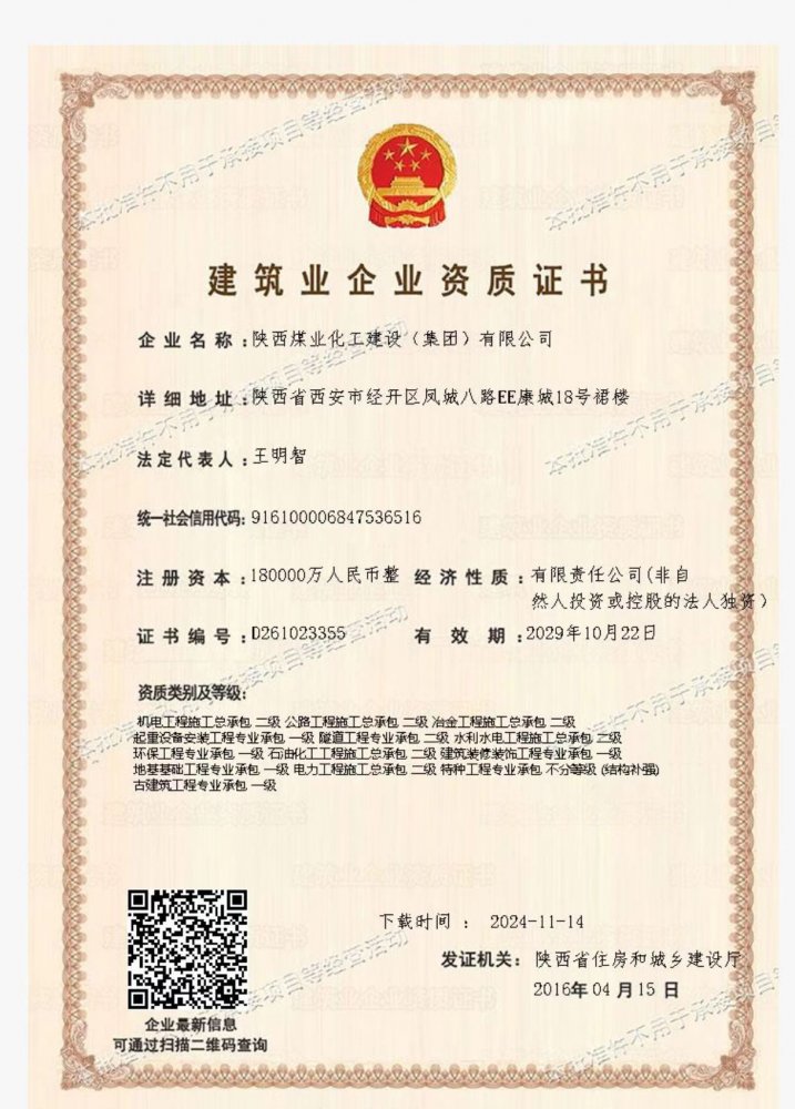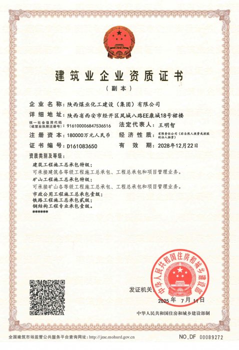 擁有建筑工程施工總承包、礦山工程施工總承包“雙特級(jí)”資質(zhì)和建筑行業(yè)甲級(jí)、煤炭行業(yè)(礦井、選煤廠(chǎng))專(zhuān)業(yè)甲級(jí)設(shè)計(jì)資質(zhì);市政公用工程、鋼結(jié)構(gòu)工程、起重設(shè)備安裝工程、環(huán)保工程、建筑裝修裝飾工程、地基基礎(chǔ)工程、古建筑工程一級(jí)承包資質(zhì);機(jī)電工程、公路工程、冶金工程、鐵路工程、水利水電工程、石油化工工程、電力工程、隧道工程二級(jí)承包資質(zhì),同時(shí)具有特種工程專(zhuān)業(yè)承包資質(zhì)。